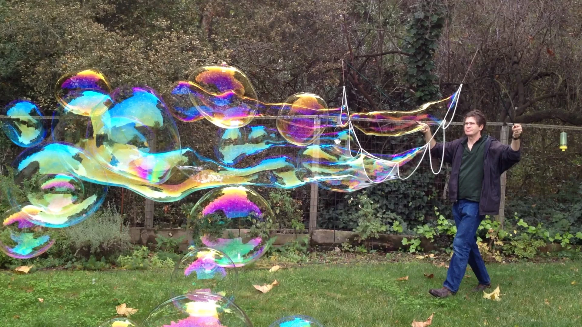The Garland wand or Bubble Garland consists of a series of looplets attached to handles. It is a tri-string variant invented by Keith Johnson in 2005 which allows the creation of a large number of bubbles at once in one dip.