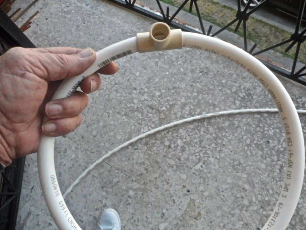 To begin wrapping the hoop with cord I drill one 7/32" hole all the way thru the tube near the "T"