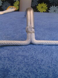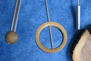 MATERIALS: A closed-end wrench or crescent wrench with a hole in its handle. A length of 1/4" or 6 mm round aluminum rod. Some epoxy putty for "welding" the hoop closed. You could substitute an appropriate adhesive such as JB Weld. Twine for wrapping the hoop OR some sort of material that can be slipped over the rod such as hollow tape-style yarn or diamond braid cord whose core has been removed.