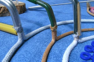 Homemade hoop being wrapped with cotton twine.