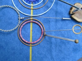 A collection of handmade hoops and a plastic commercial hoop.