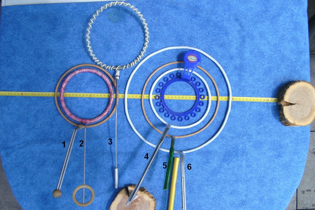 A collection of handmade hoops and a plastic commercial hoop.