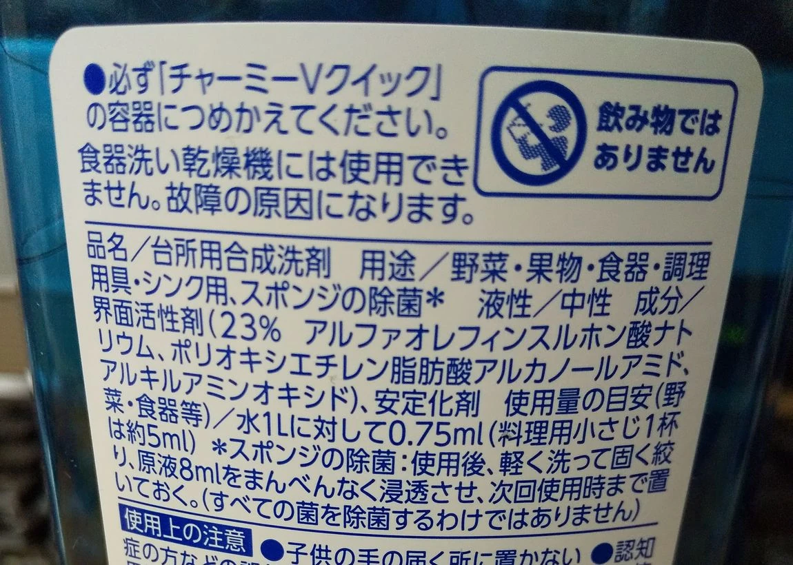 チャーミーVは深くは調べてなかったですが、面白そうな洗剤だなと思いました。 というのは、HPで成分情報をよく見てみると表面改質剤としてゼラチンが配合されているらしいのです。表面改質剤として使われているということは、つまり皿を洗っている最中に皿の表面をゼラチンで薄くコーティングし、それによって水を弾いて、乾きを早くするという話だと思います。この考え方はそのまんま「チャーミーマジカ速乾+」に引き継がれています。「チャーミーマジカ速乾+」のほうは、ゼラチンではなくカチオン化セルロースを使っているのですが、やはり同じように皿の表面をセルロースで覆って水を弾かせ速乾性を附与するという発想です(ただカチオン化セルロースはシャボン玉には向かないようです)。 ともあれ食器用洗剤にゼラチンを配合するっていうのは聞いたことなかったです。実際シャボン玉に関してはどうなのかわかりませんが、チャーミーVは、私も今度調べてみようと思います。