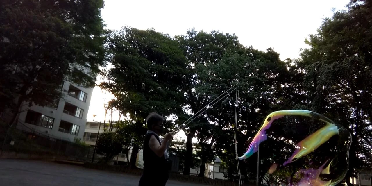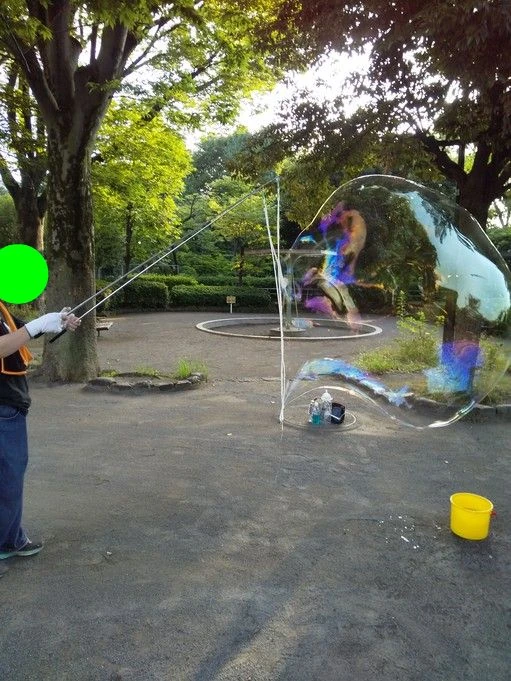 P.S. 関東にお住まいでしたら、同じバブラーさんに会うことができれば、とても良い刺激になると思います。栗坂さん([1]https://www.instagram.com/yoyogibubbleman/)は都内の代々木公園、千葉の昭和の森公園でシャボン玉をやっておられる方で、日本で今のスタイルのバブリングを最初に始められた方です。竿の作り方や液の作り方など、洗練された知識と技術をお持ちの方です。