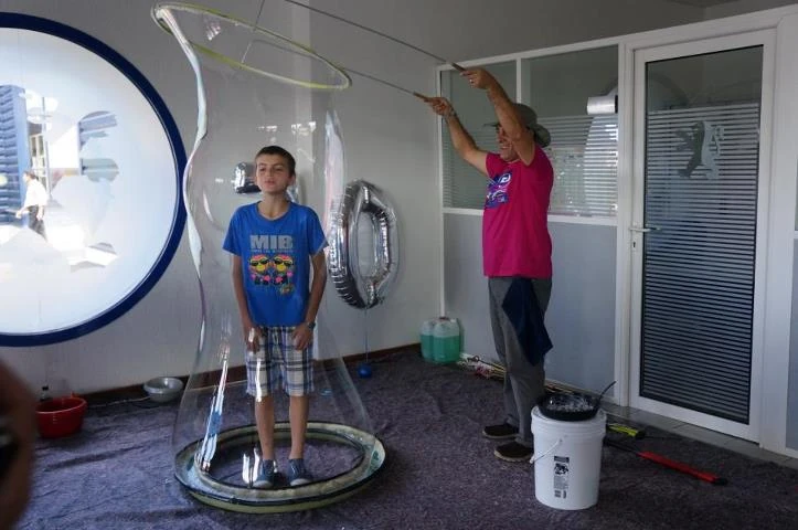 それからバブルインバブルはやっていますか?これは楽しいだけではなく、ポリマー量が適切かを見る良い判断基準になります。簡単にできる場合は適切ですが、息を吹きかけた途端に割れてしまう場合はポリマー量が足りていないということです。 膜面に出来るだけ顔を近づけて、口先を小さくすぼめて細く鋭い息を吹き込むのがコツです。