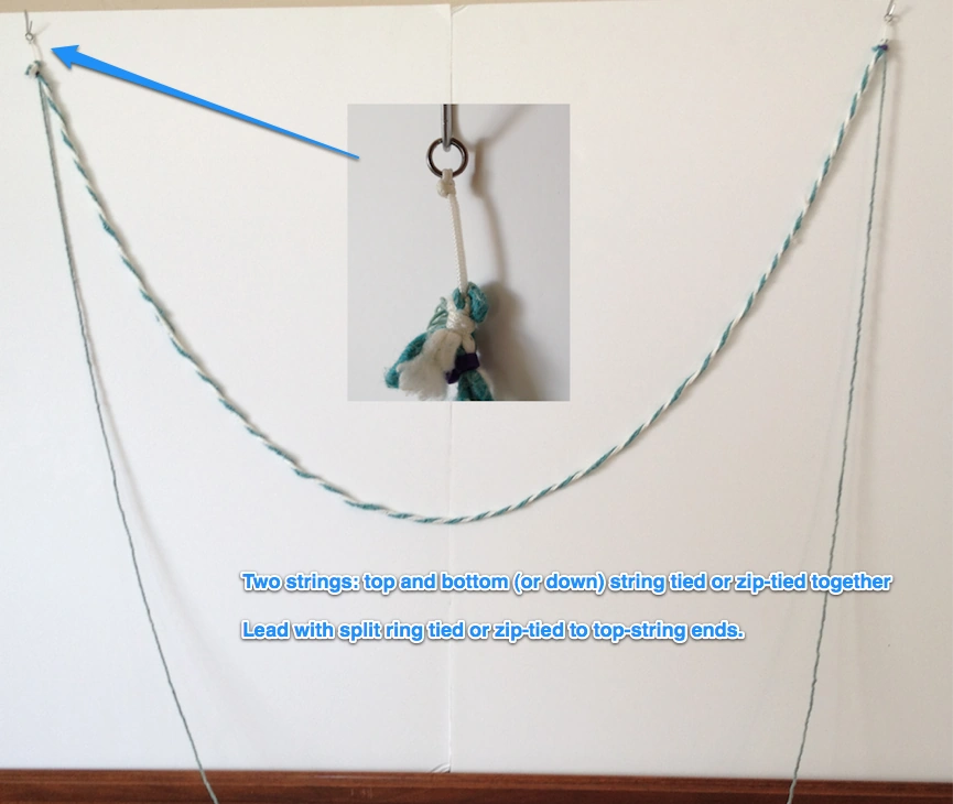 This is probably the most common design. The loop is made of a top-string that is roughly one-half the length of the bottom string. The top and bottom strings can be tied together or zip-tied together. Zip ties work just as well as knots but may not work well with very thin loop materials such as single strands of yarn or thin twine.